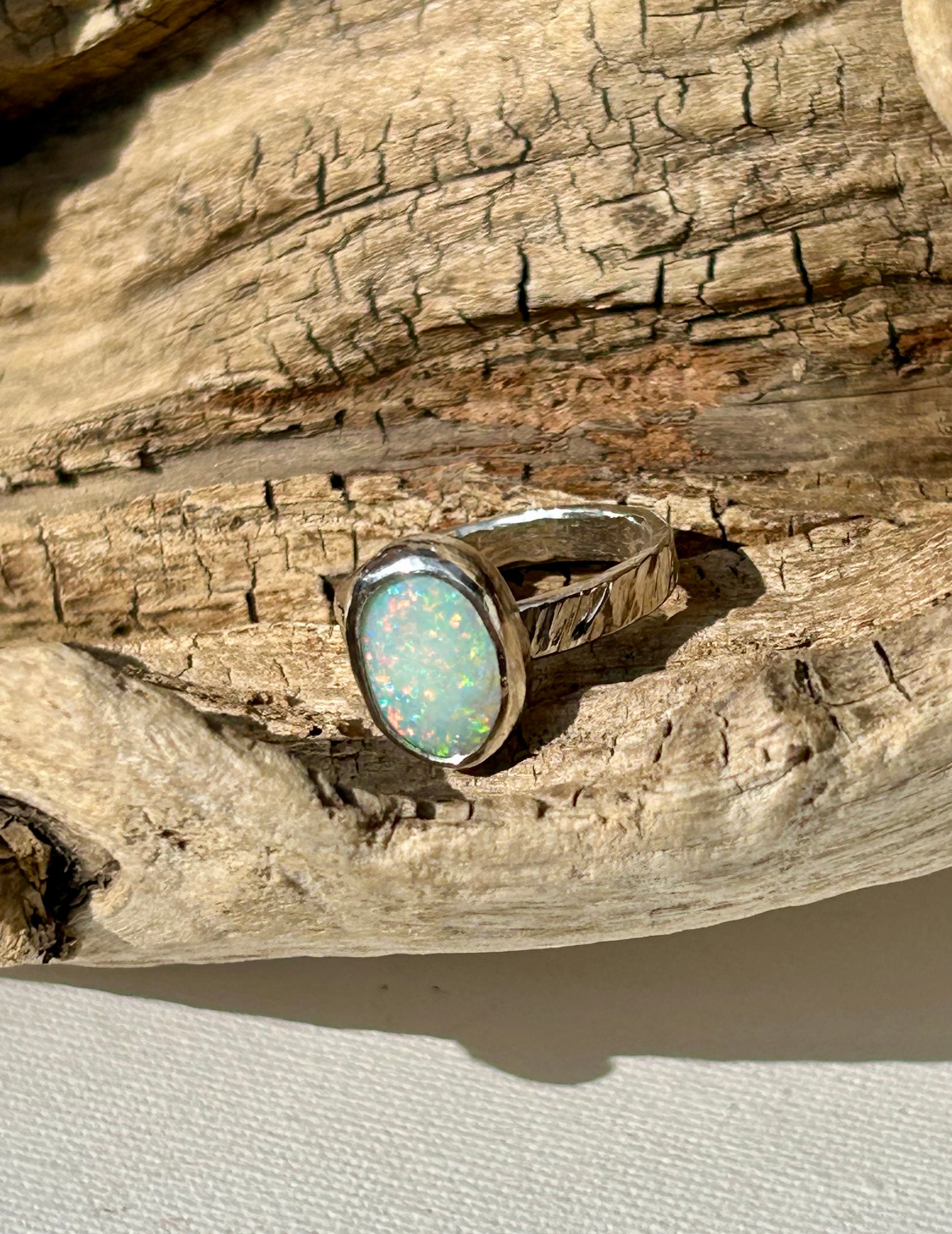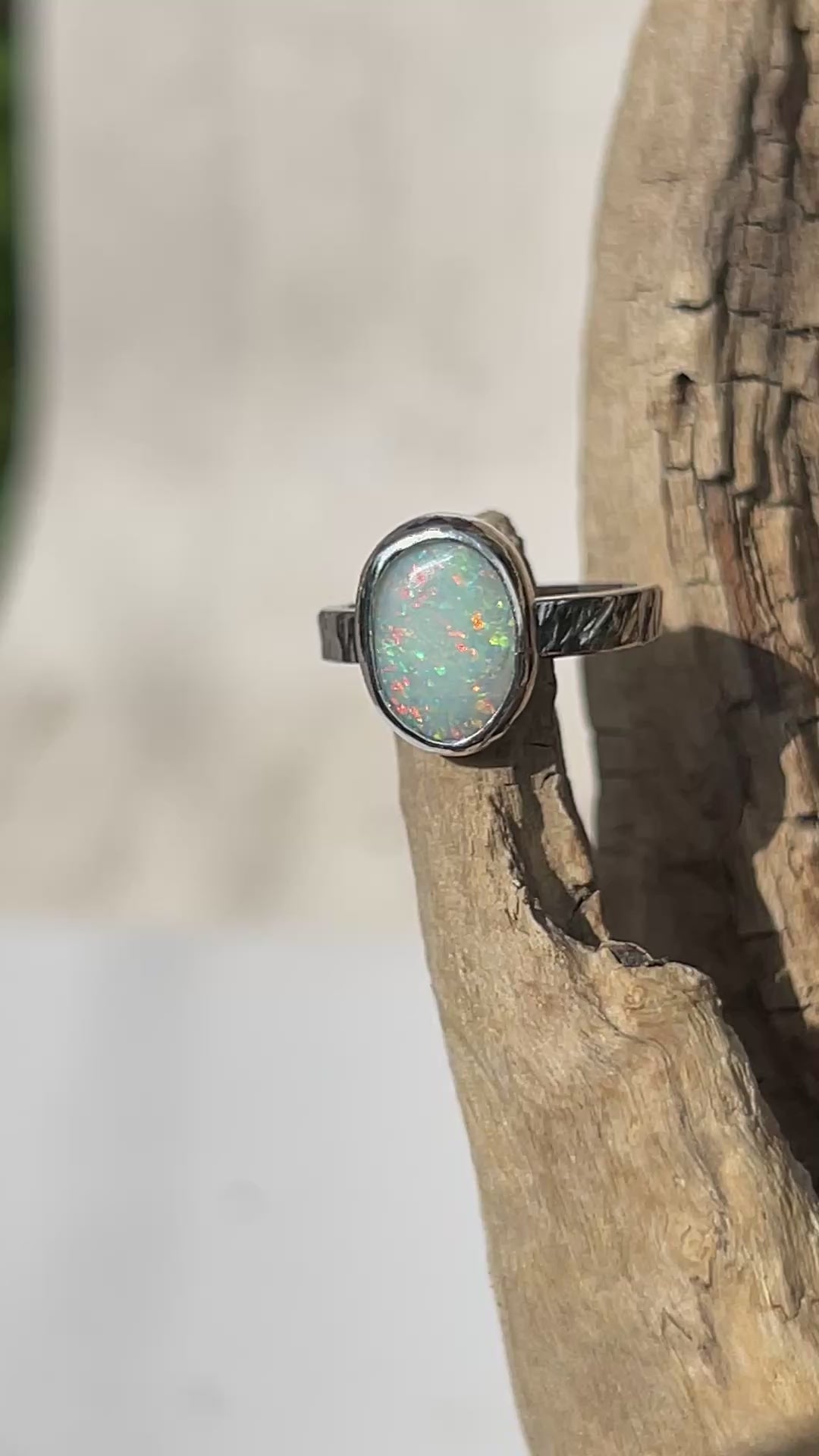 Glittery solid Coober Pedy opal ring, showing a rainbow of colours.