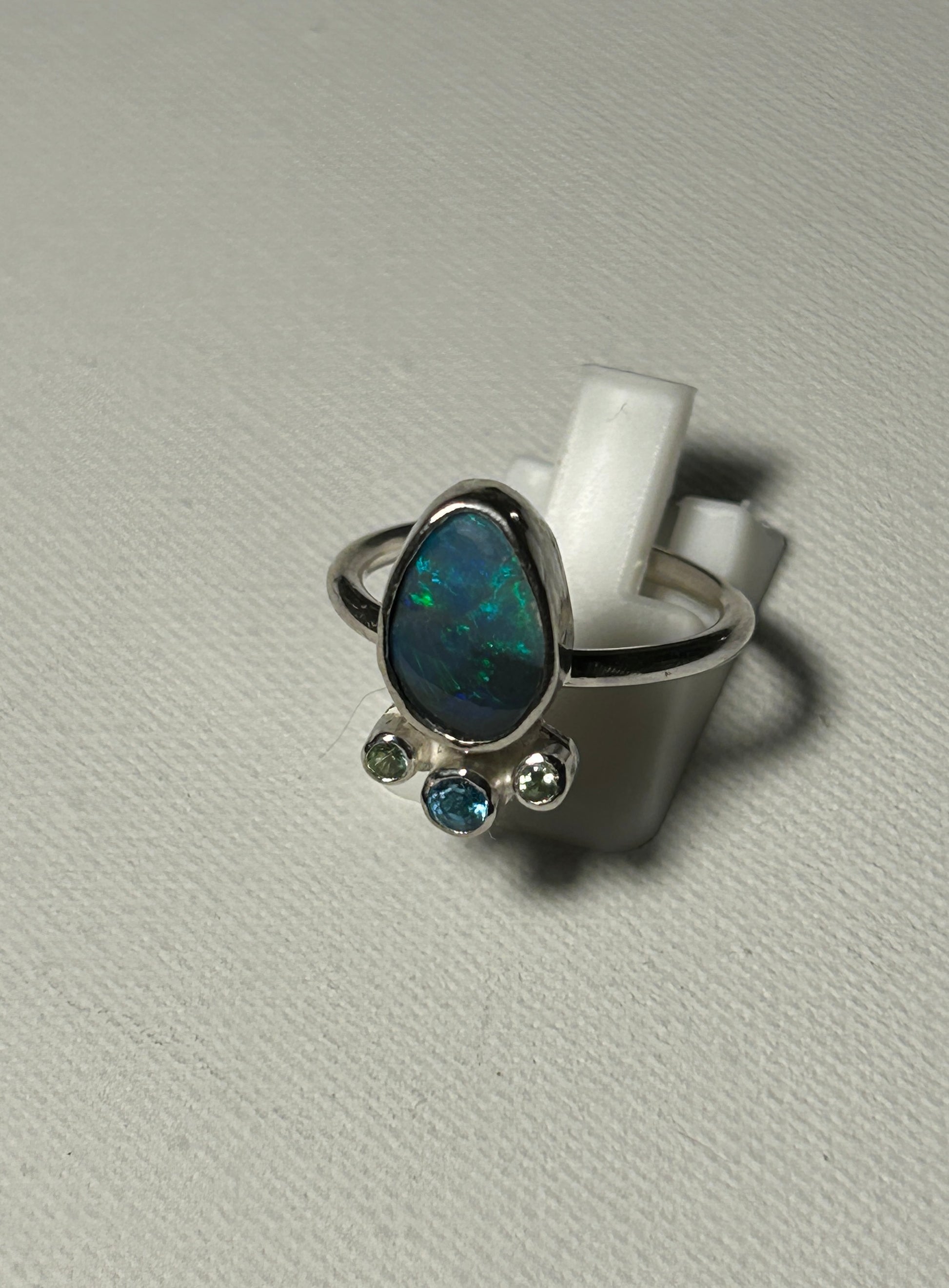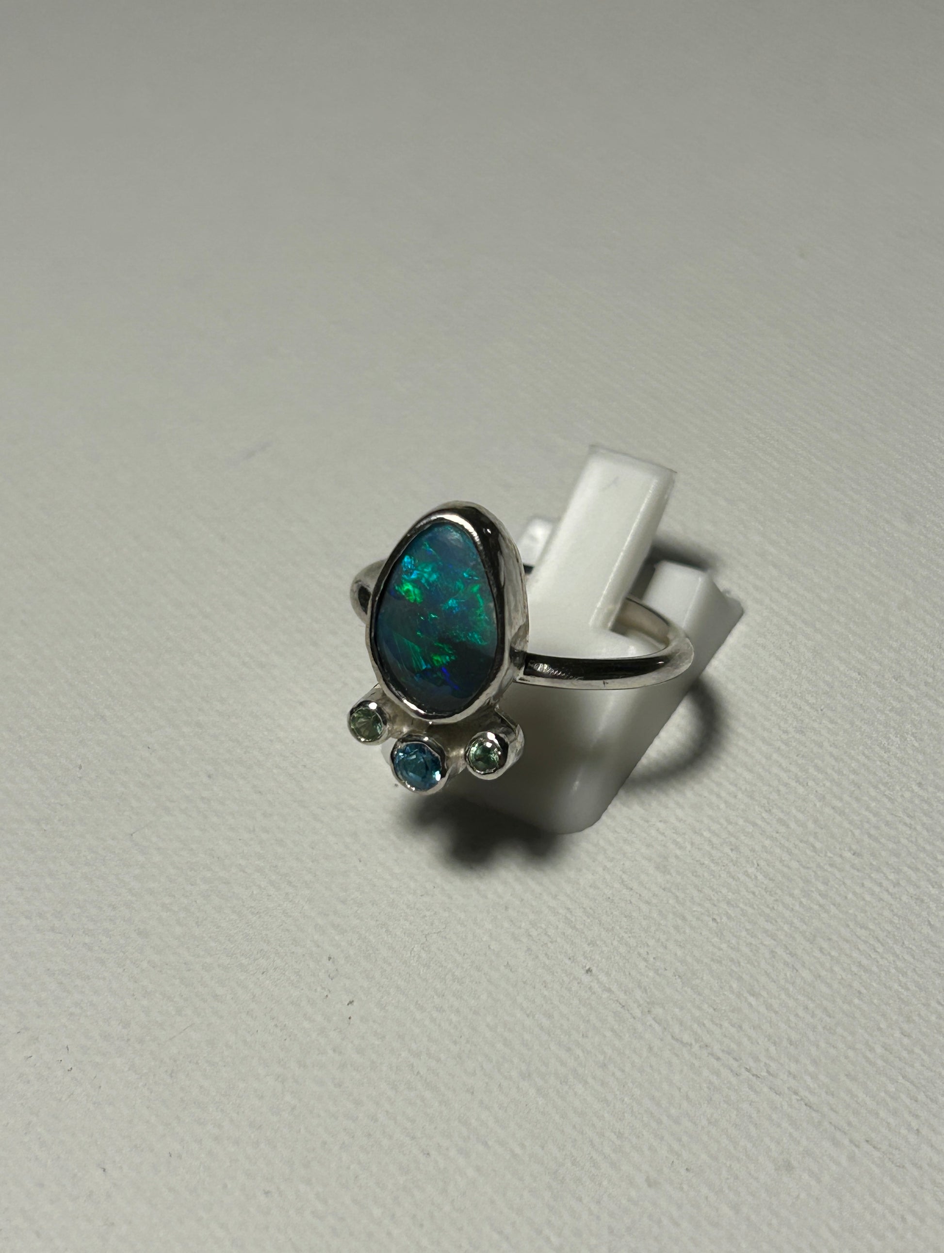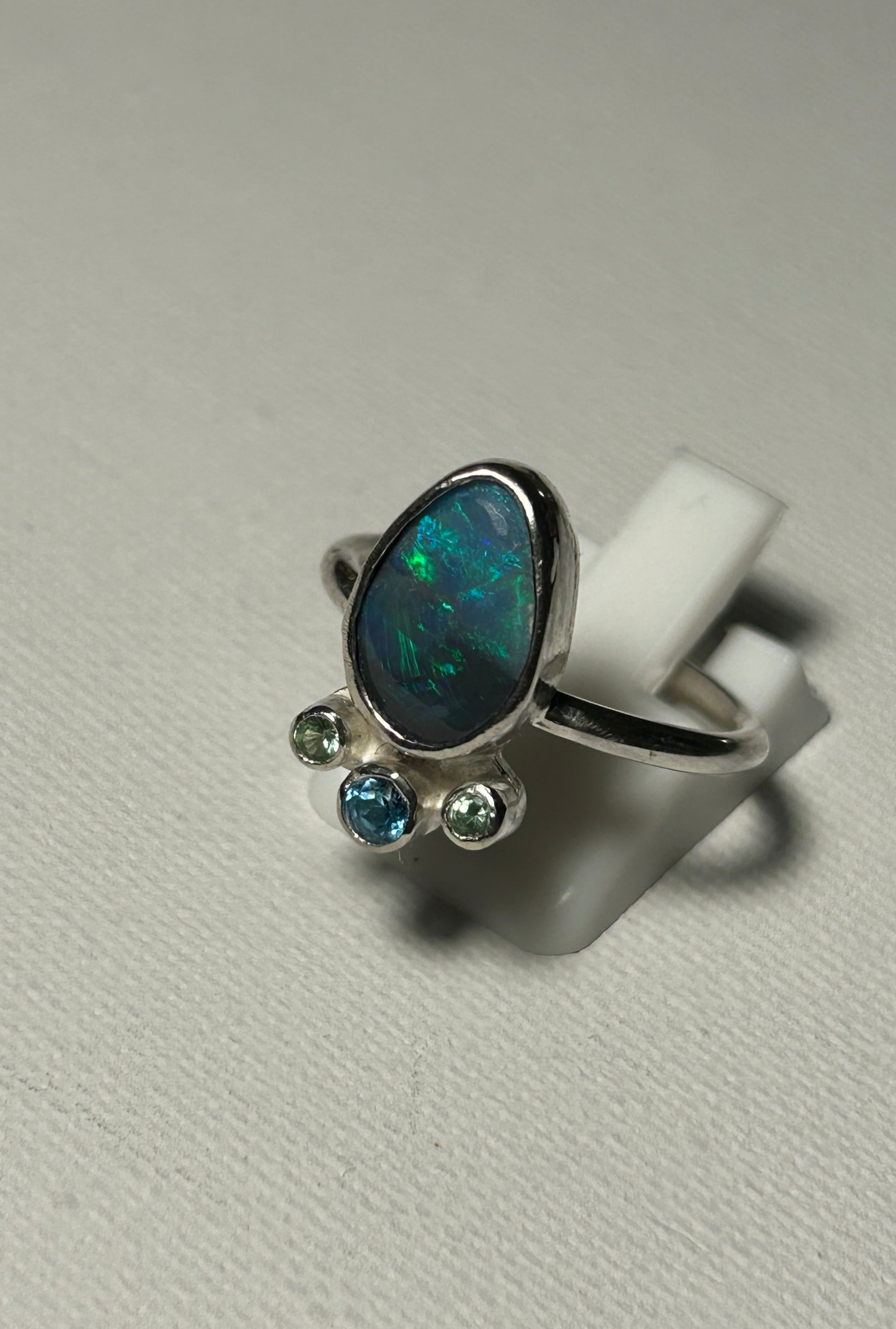 Solid green blue dark opal with a Swiss blue topaz and two tsavorites set in sterling and fine silver crown style ring.