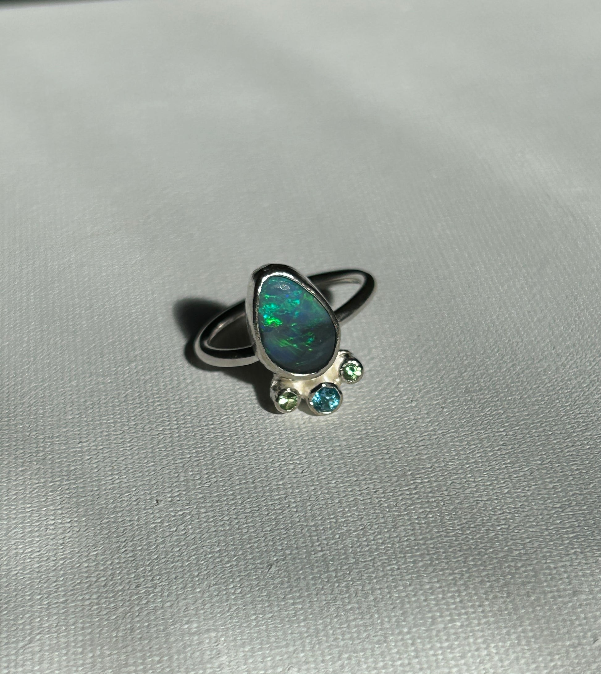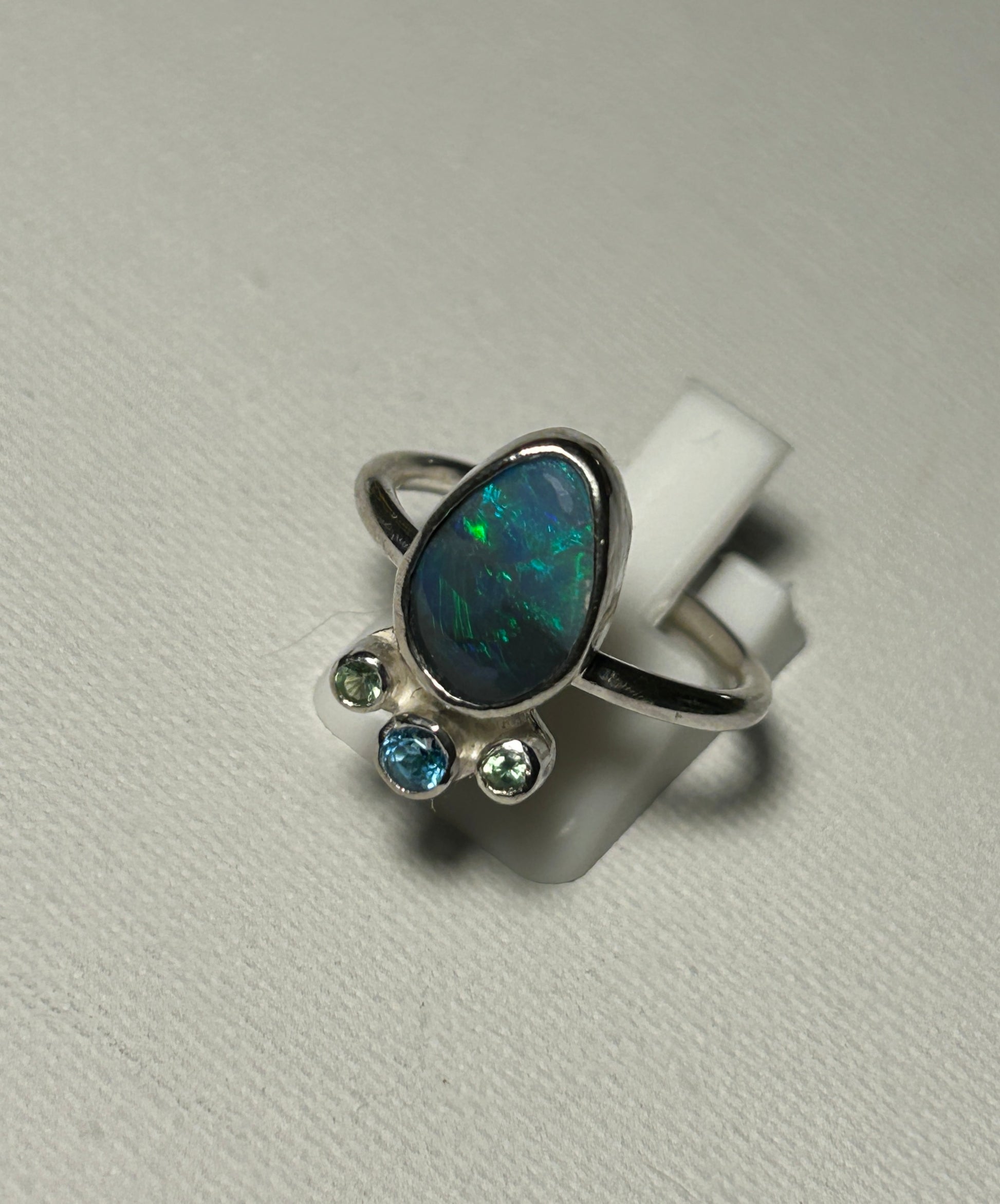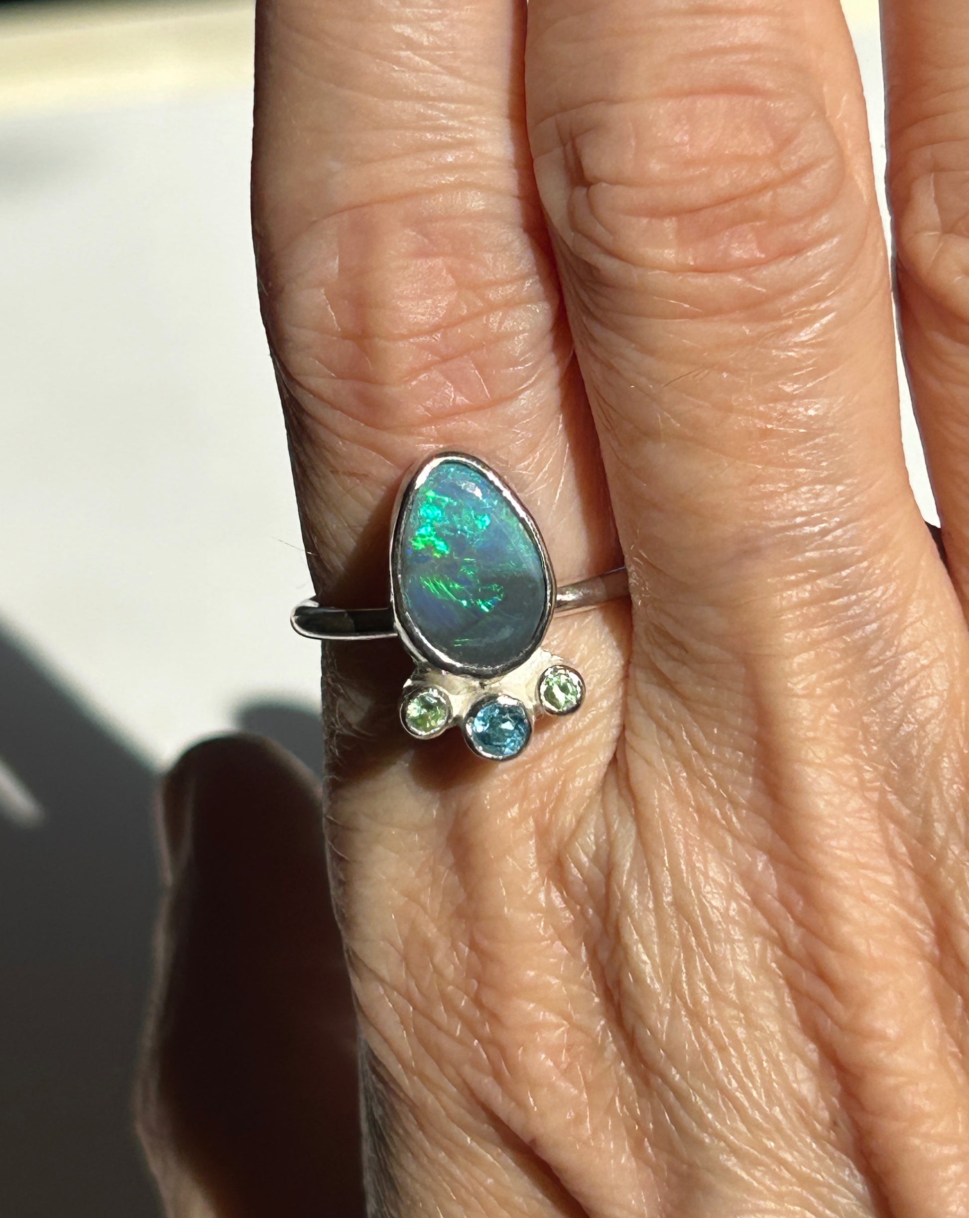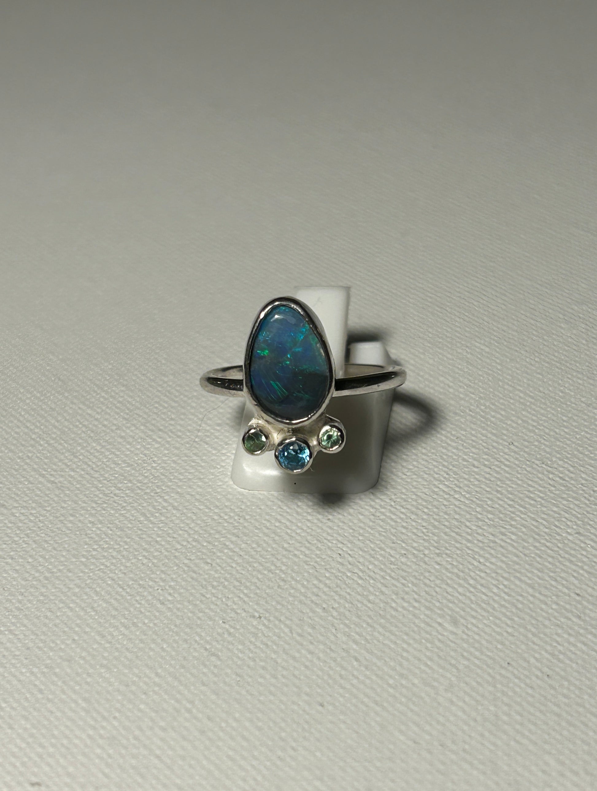 Solid green blue dark opal with a Swiss blue topaz and two tsavorites set in sterling and fine silver crown style ring.