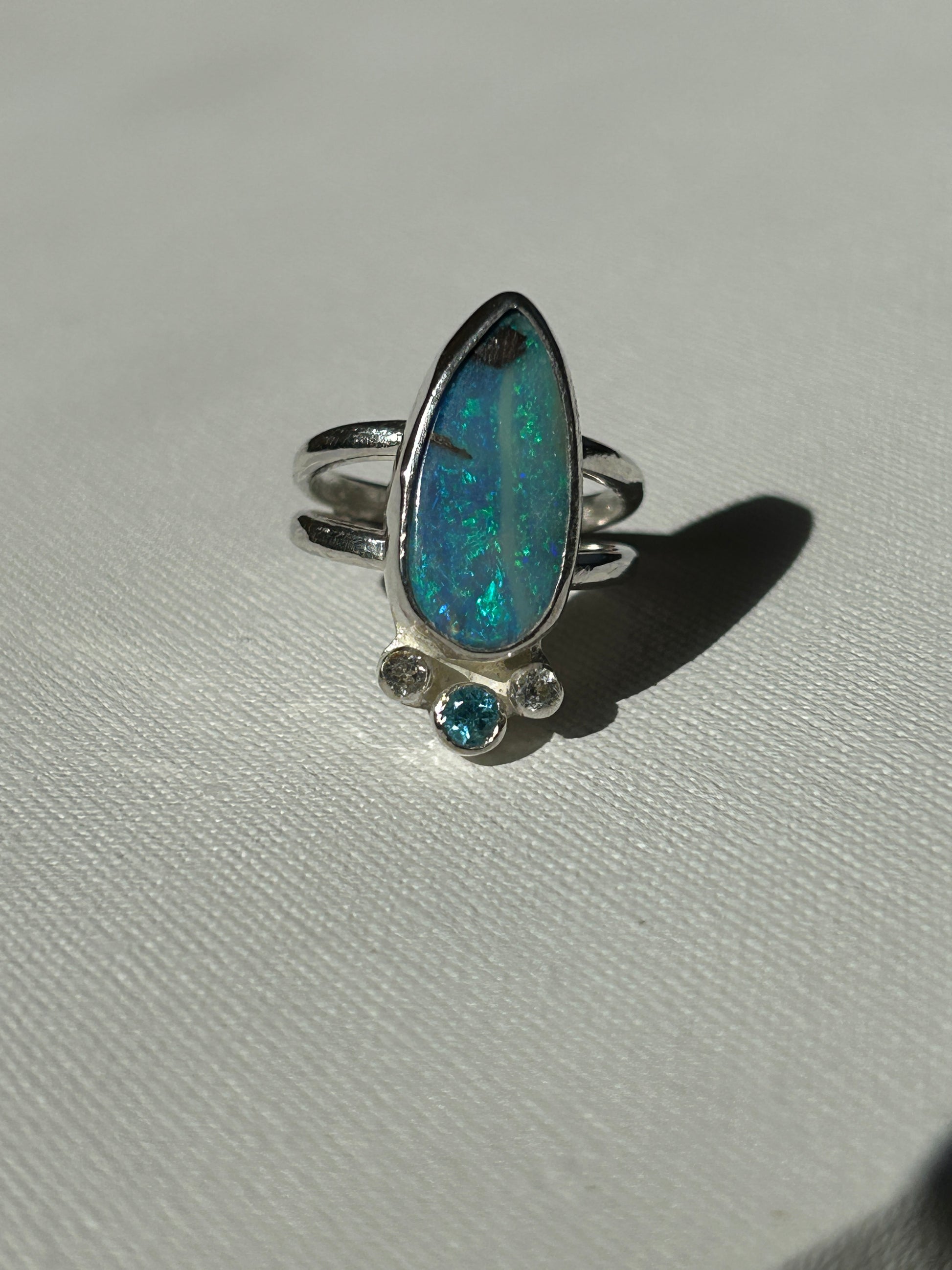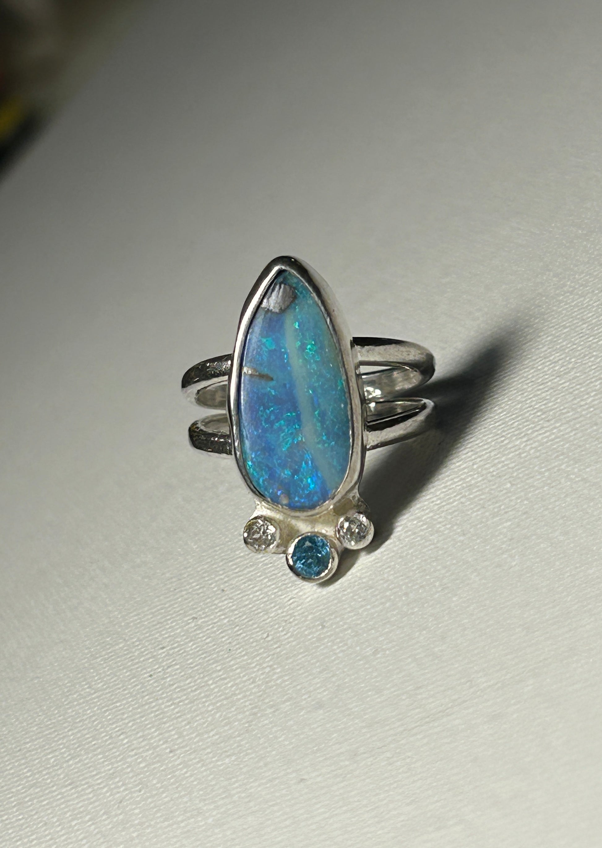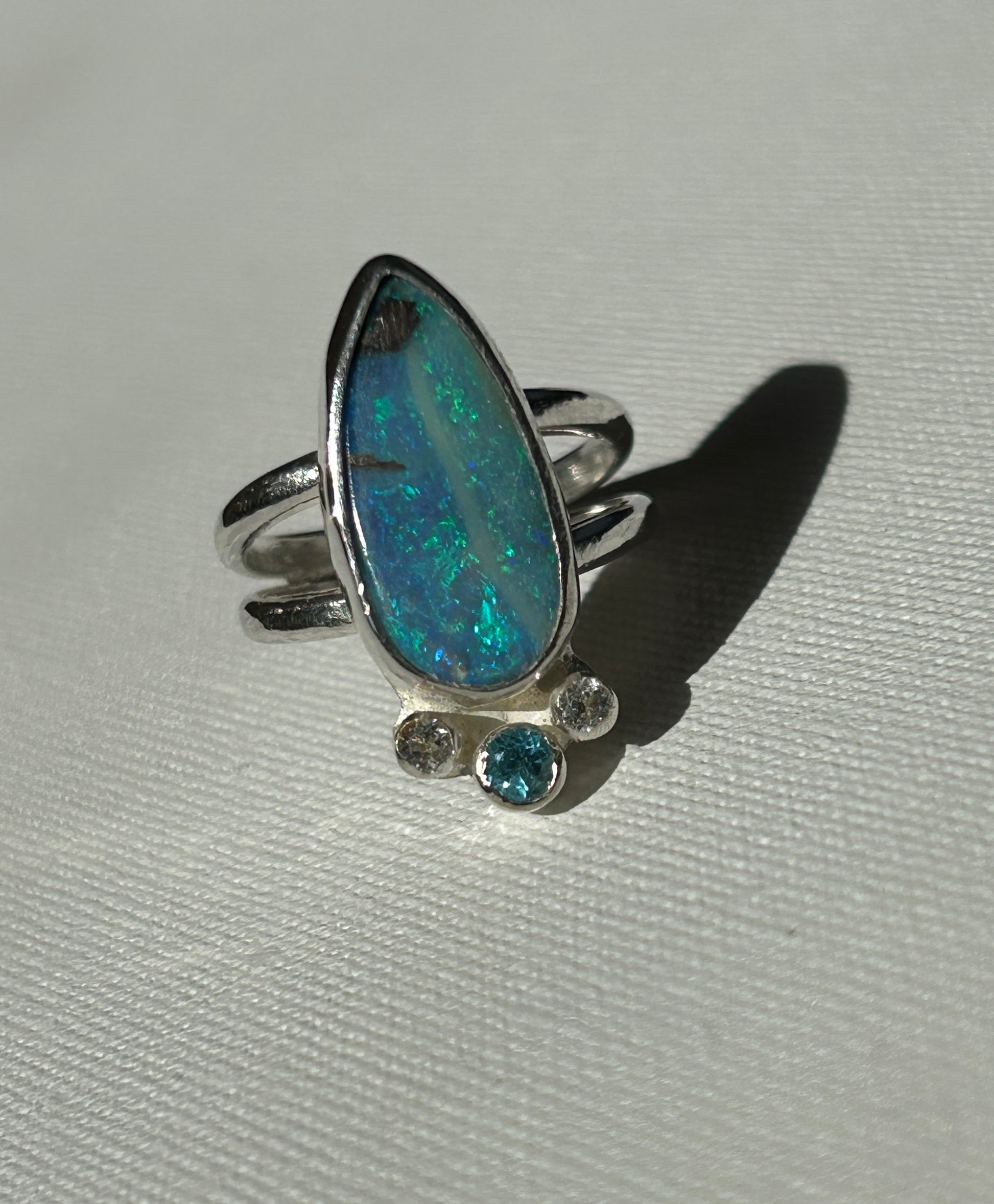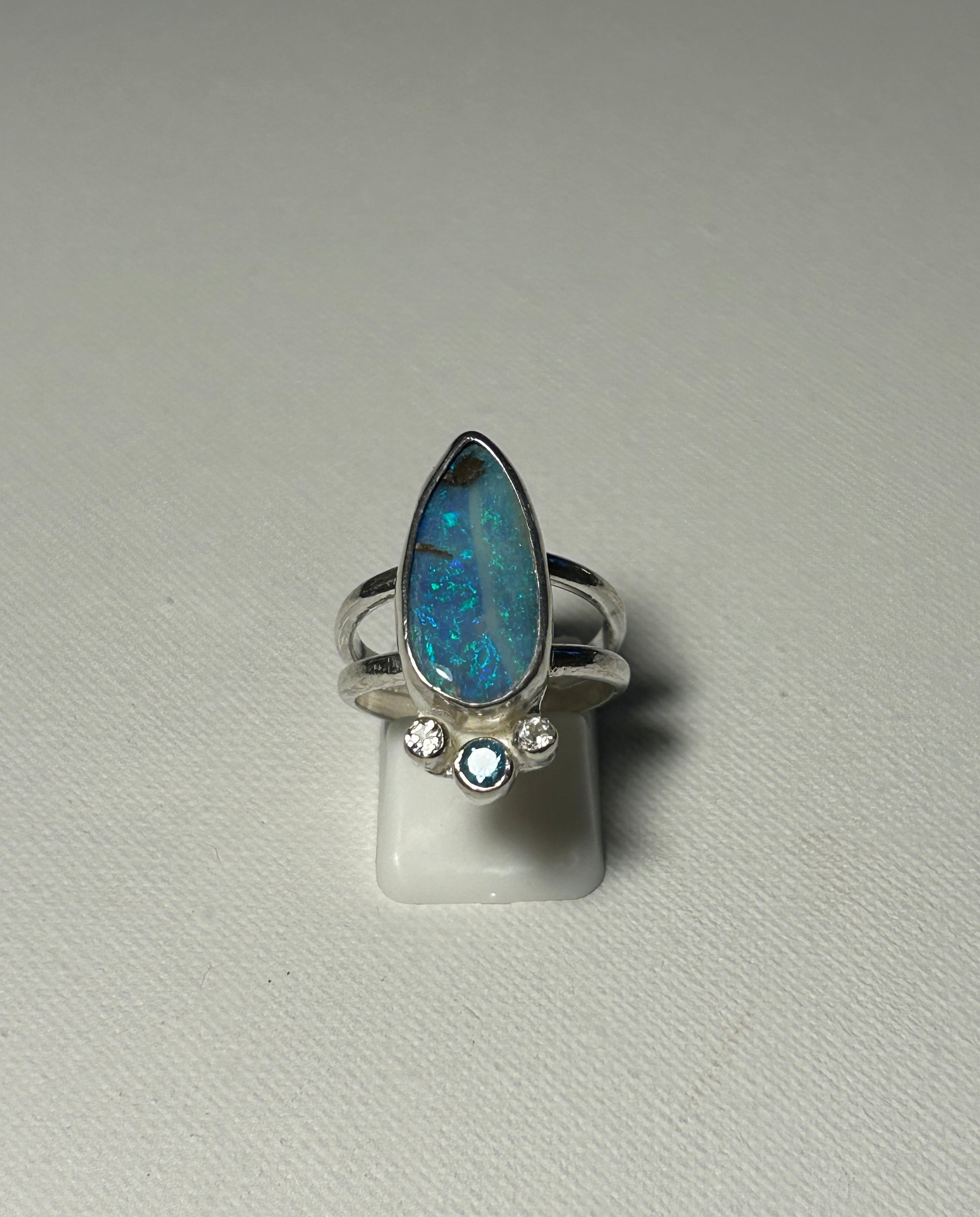 Beautiful blue/aqua boulder opal with a Swiss blue topaz and moissanites adorning the base of the ring. Set in the well loved crown style and set on a double band.