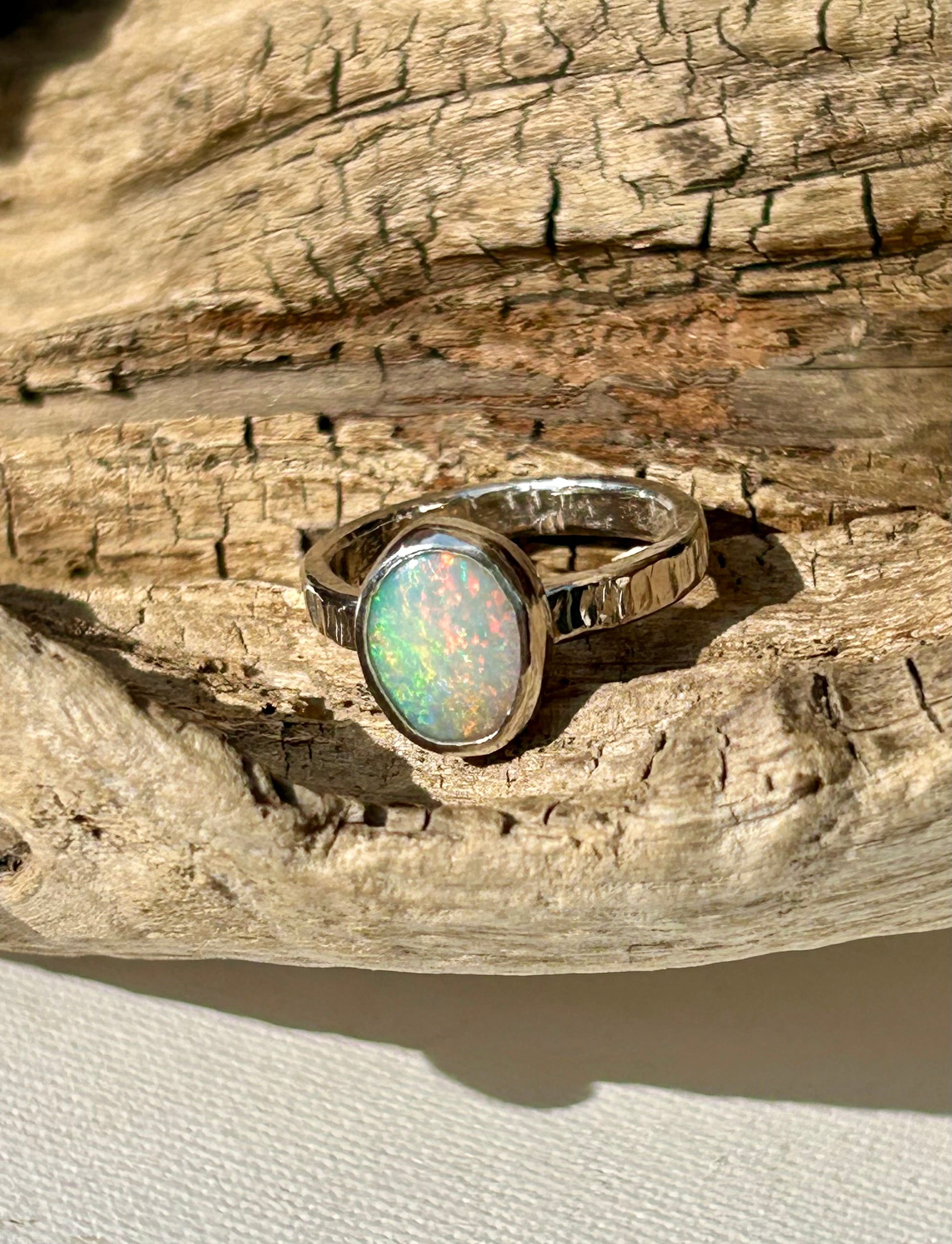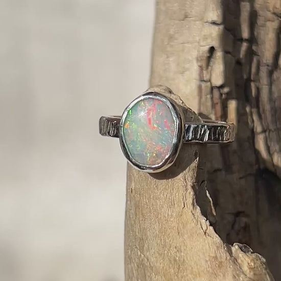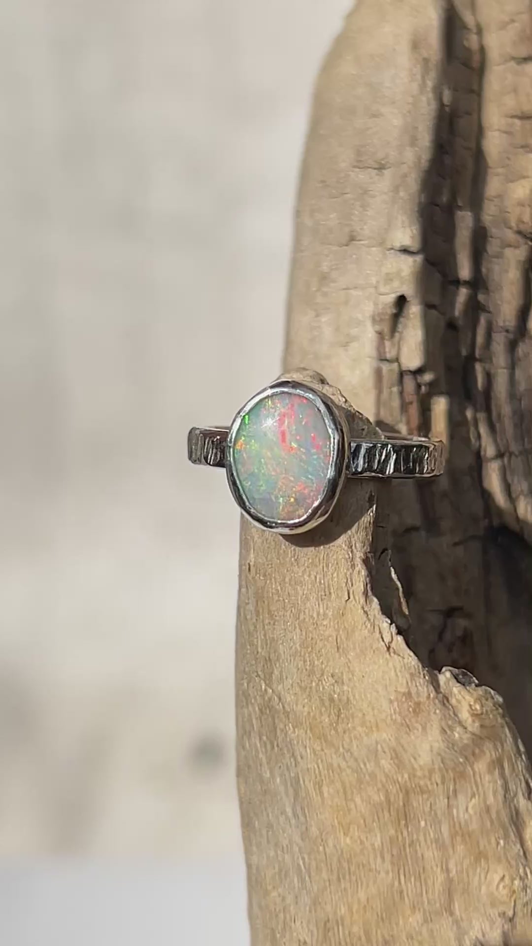 Glittery solid Coober Pedy opal ring, showing a rainbow of colours.